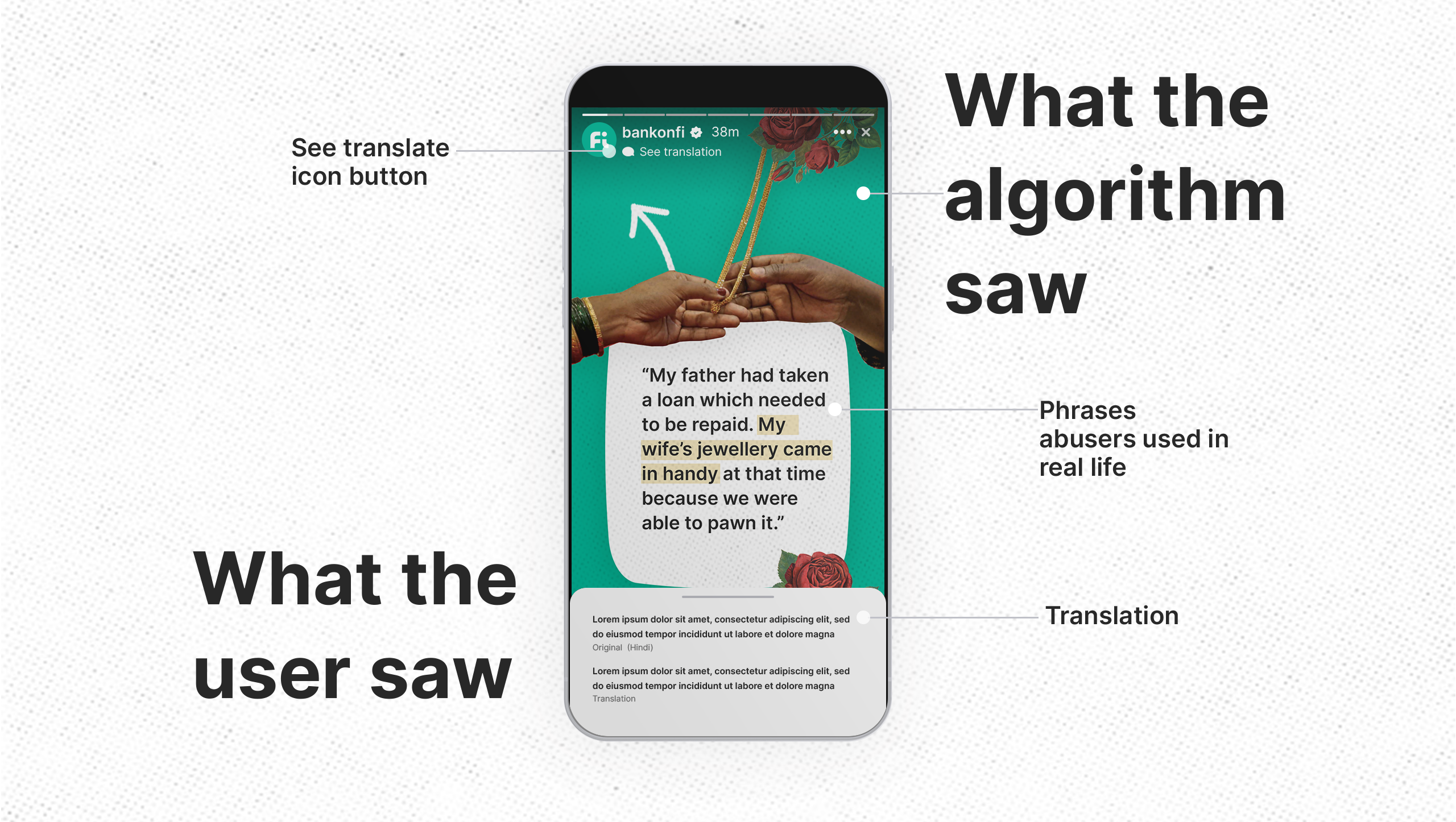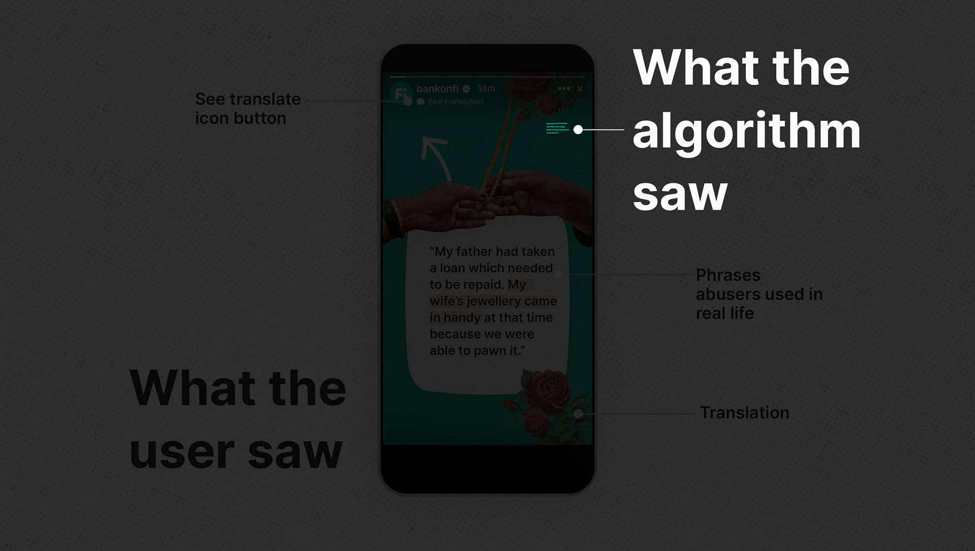 The Love Language Translator cleverly hacked Instagram’s story translation feature to reframe everyday relationship language. By curating and sourcing hundreds of real-life accounts, the campaign presented these stories in a fictionalised format, highlighting how emotional and financial abuse is frequently disguised as love, care, or concern.