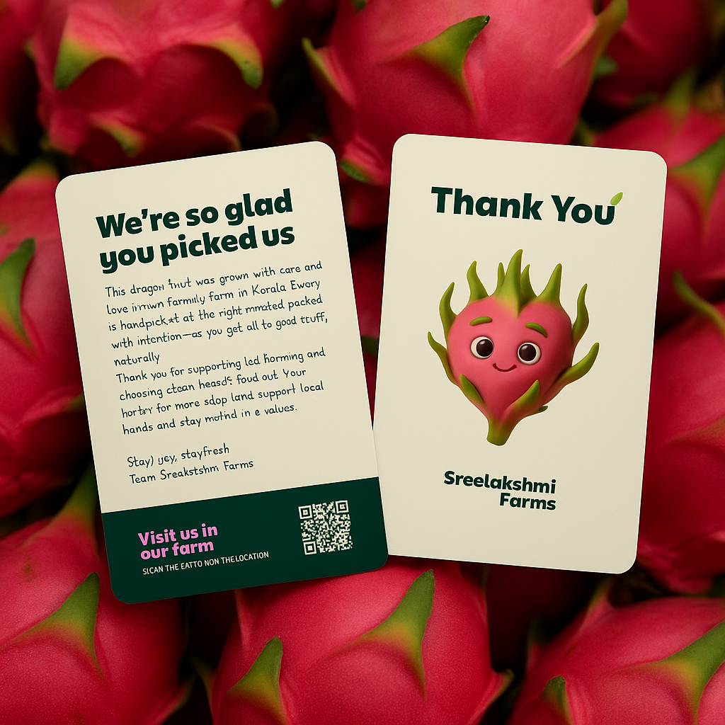 We also created bilingual content in both English and Malayalam to ensure the brand feels locally rooted while remaining widely accessible. The result is a brand identity that feels honest and connected, one that works seamlessly across touchpoints, whether it’s on the fruit packaging, printed collateral, or at the farm itself.
