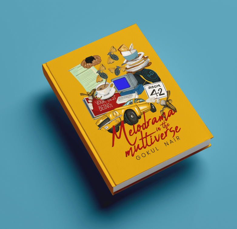 Melodrama in the Multiverse by Gokul Nair is a collection of short stories, each unfolding in its own distinct universe. We designed the cover as a layered illustration, bringing multiple stories, symbols, and universes into a single frame.